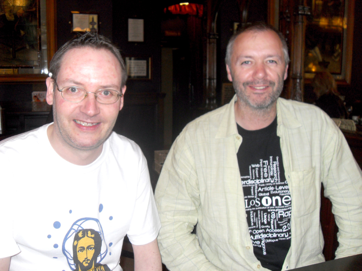 The Co-Founders of PeerJ, Pete Binfield (Publisher) and Jason Hoyt (CEO) first met in August 2009 for an episode (episode 14 to be precise) of Dr Kiki’s most excellent This Week in Science show. The full episode was online at the original source (I know because I watched it a couple of times), it’s probably on the web somewhere although there is a short section of it here on YouTube and there is also this rather cool mash-up version also on YouTube.